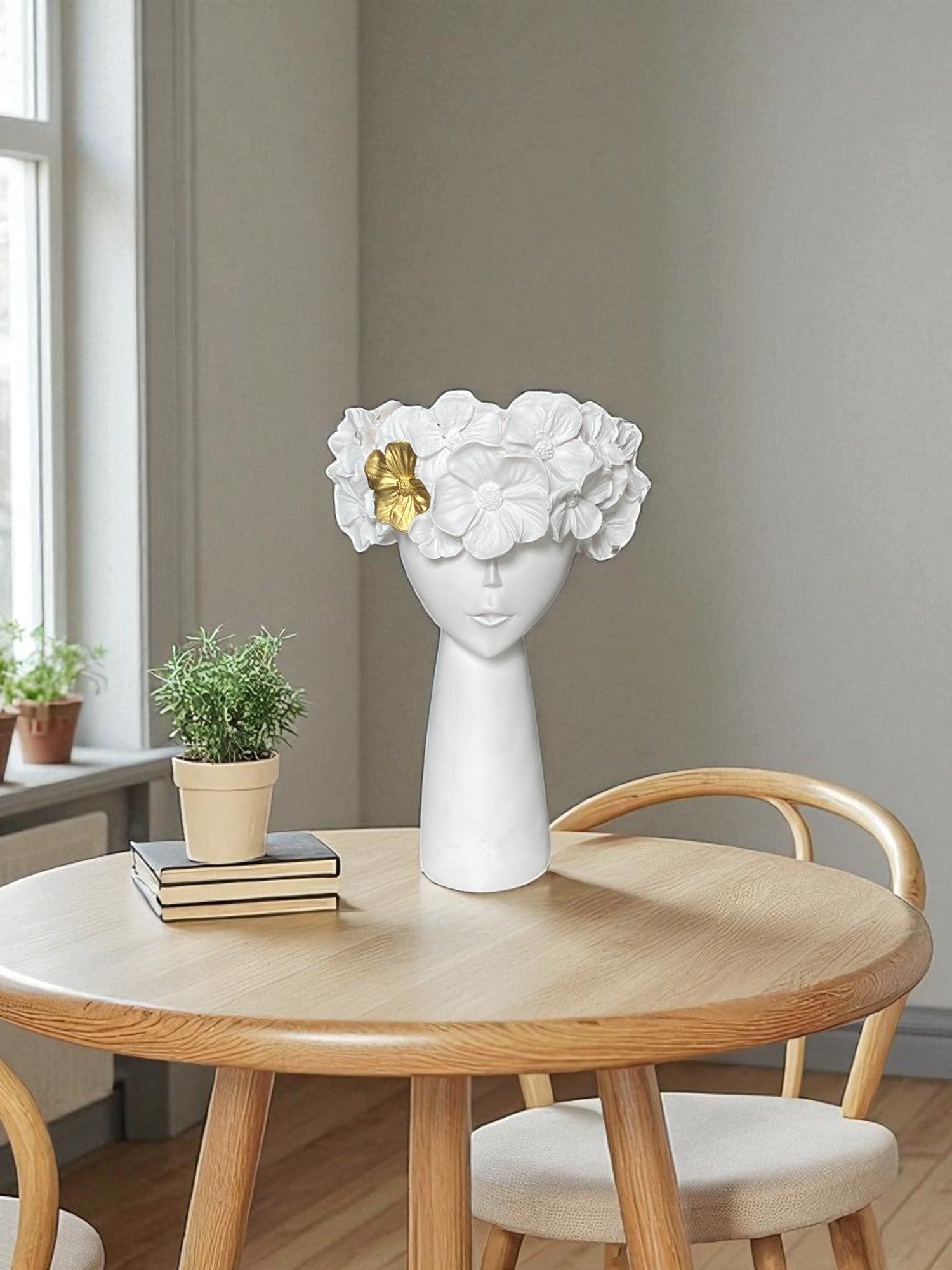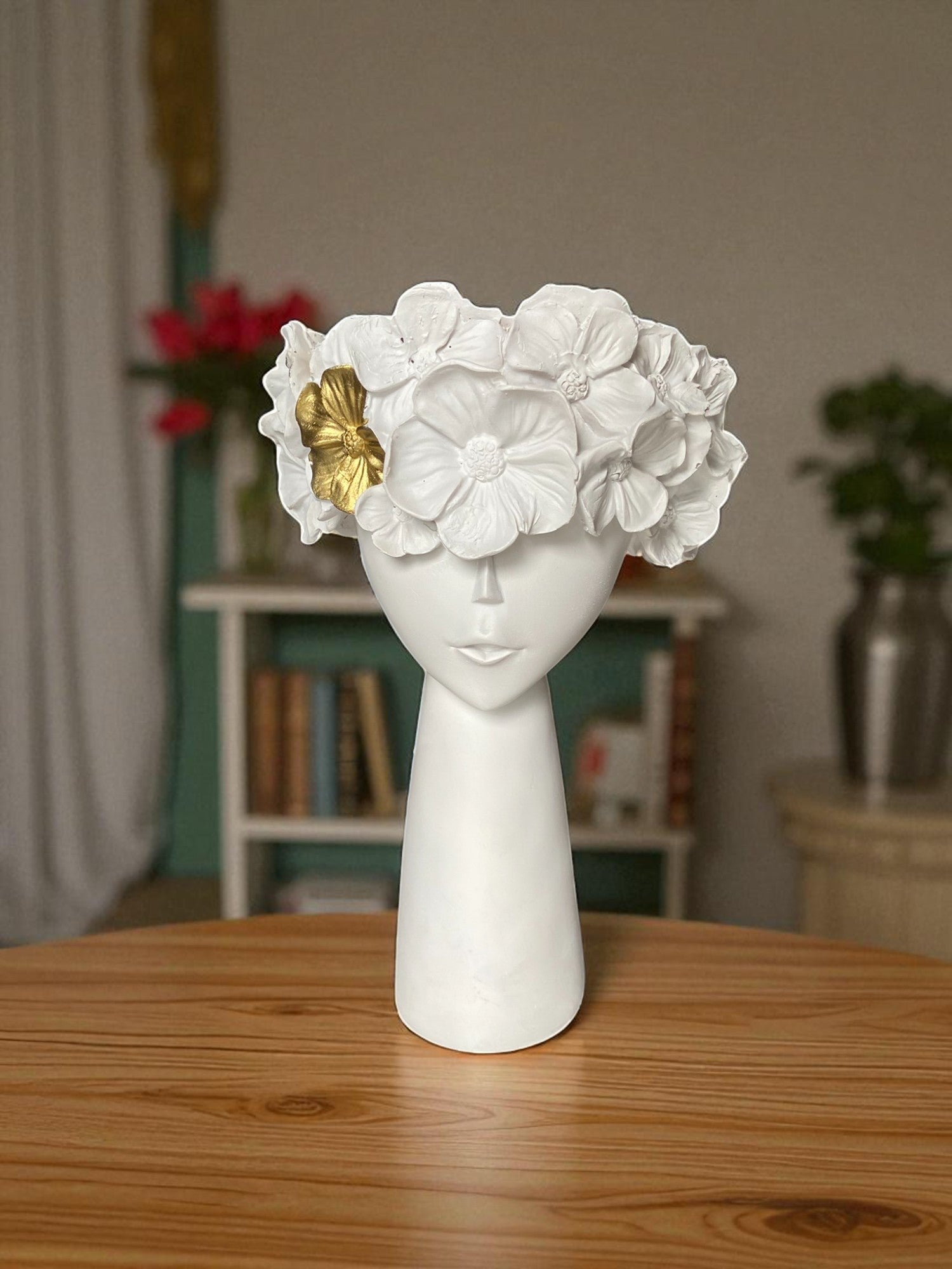 - ELEGANT DESIGN: Stunning white ceramic vase featuring a stylised face design and decorative floral crown with white blooms and a striking gold accent flower