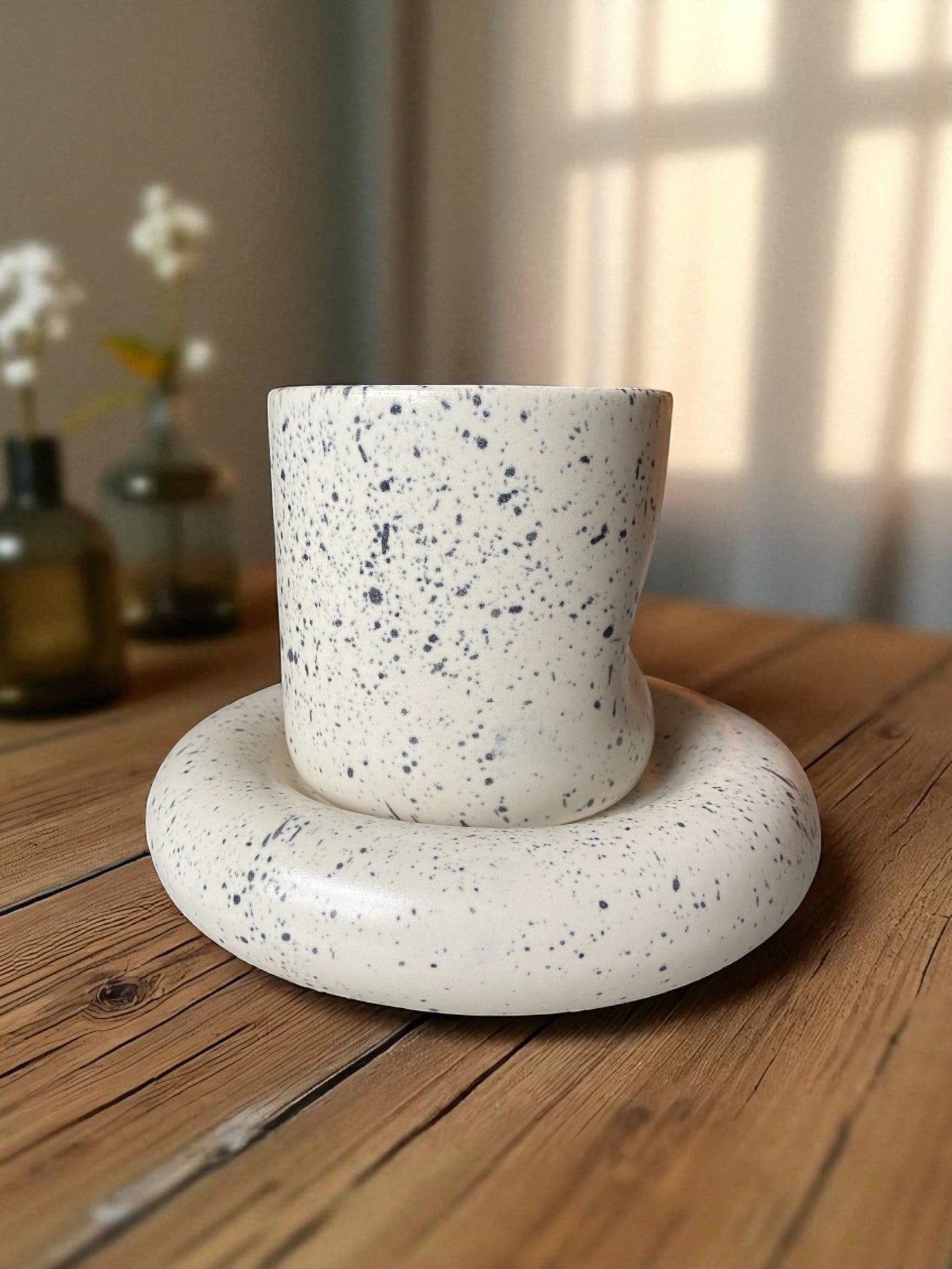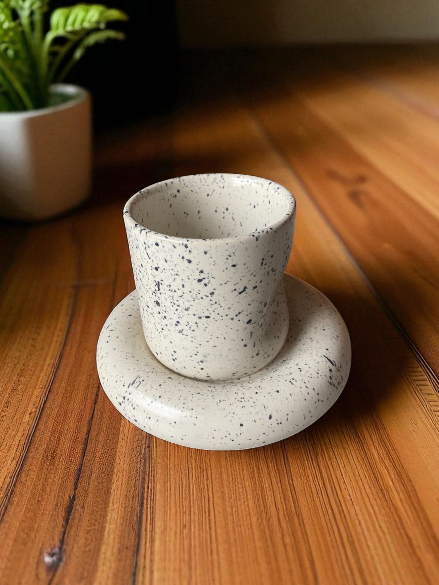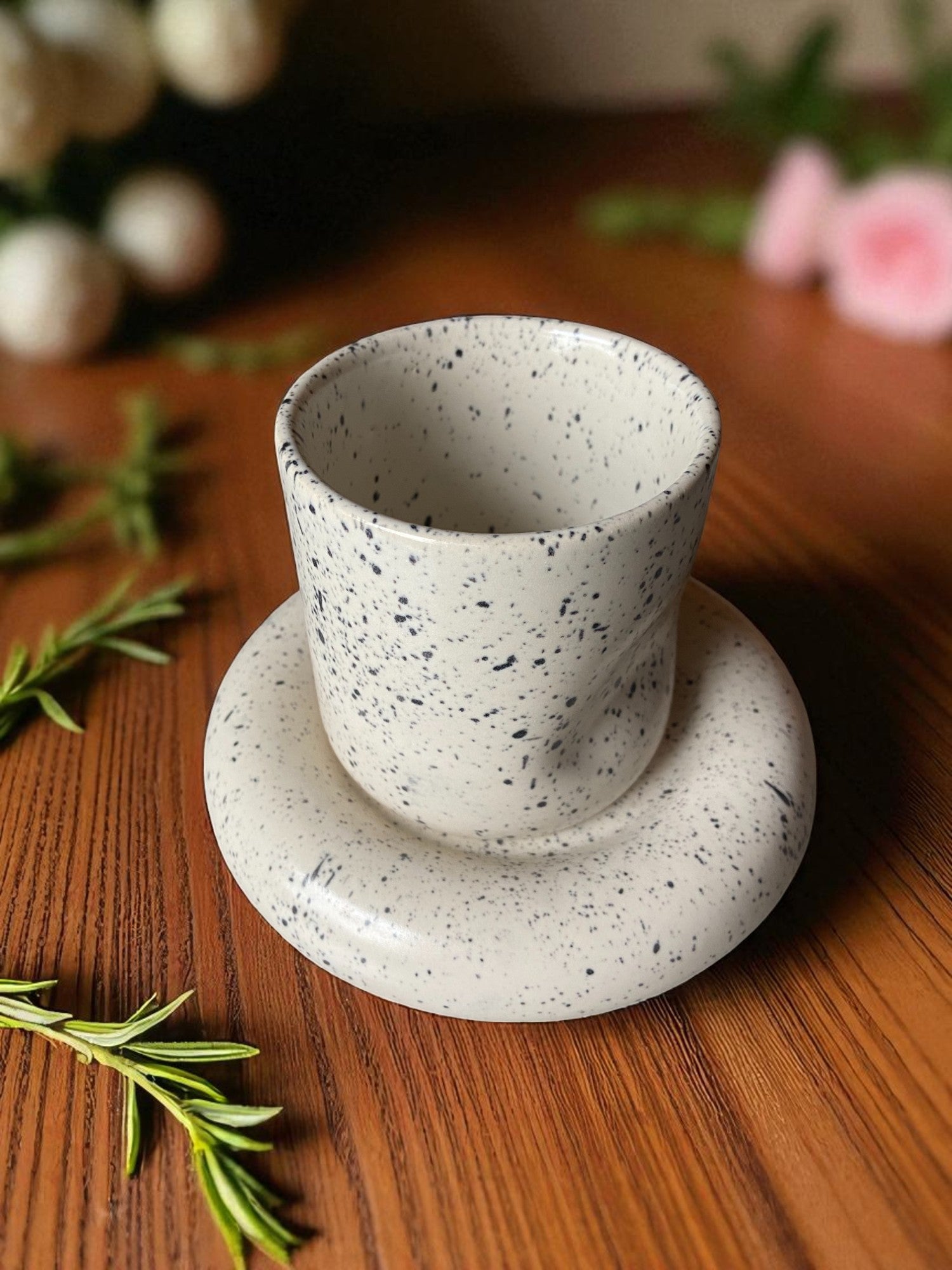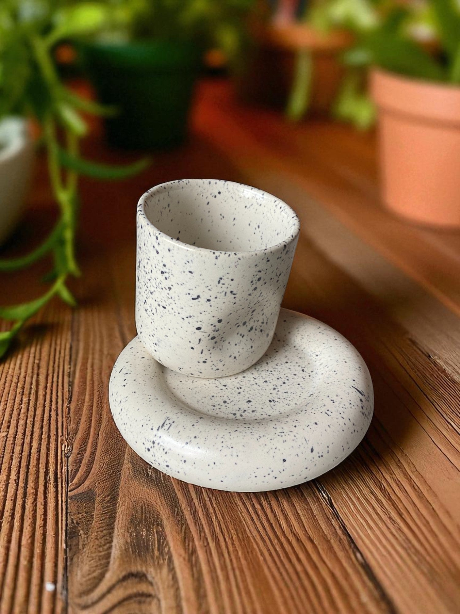 - DESIGN FEATURES: Modern speckled ceramic cup and saucer set featuring a unique white base with navy blue speckled pattern throughout